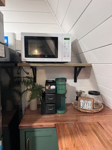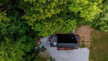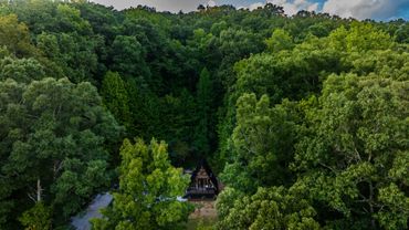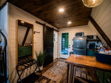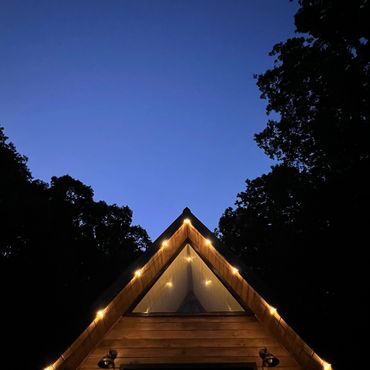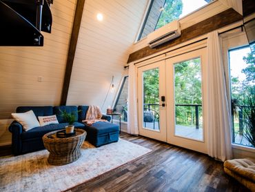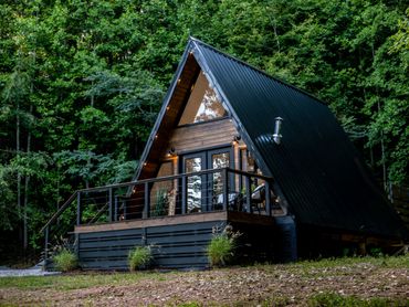 Tucked away amongst the trees, this modern aframe sleeps two and has plenty of amenities to help you unwind. The living room features a wall of windows to let in plenty of natural light. You can enjoy coffee on the front porch with the singing birds, roast smores by fire pit or shower under the stars.